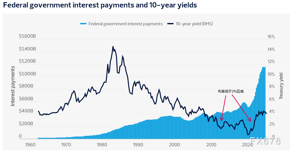 上世纪80年代后,美国长期利率总体下行,赤字支出却日益常态化,即便利率跌破2%,债务利息支出仍在持续攀升。