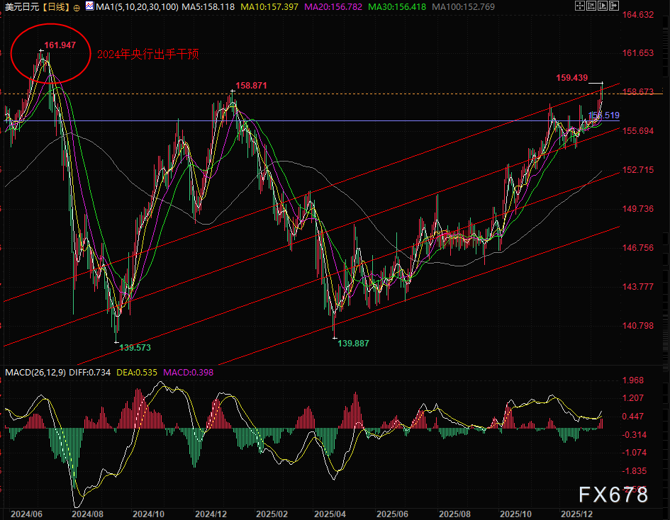 周三(1月14日)美元兑日元汇率正朝着2024年7月以来的关键关口加速迈进,目前已触及159.43的高点,距离市场紧盯的160目标仅一步之遥。