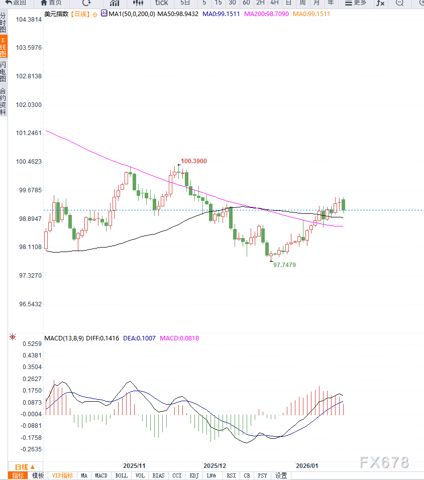 本周初美元整体表现疲软,美元指数下跌至99.15附近,在主要货币中处于弱势地位。市场情绪受到美国与欧洲在格陵兰问题上的外交摩擦影响,投资者对美元资产的信心有所降温。