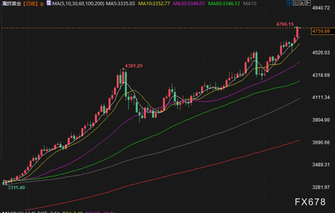 在地缘政治紧张局势加剧的推动下,黄金价格突破每盎司4700美元的里程碑,再创历史新高至4766.15美元/盎司,现货白银价格也首次升穿95美元大关。市场对政治风险的避险对冲需求急剧增加。