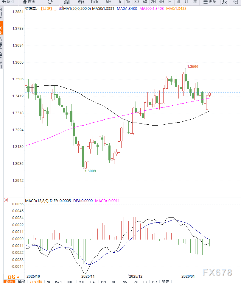 从日线结构来看,GBP/USD整体处于震荡偏强但缺乏突破的格局。价格在1.3400上方多次获得支撑,但1.3480—1.3500区域压力明显,显示多头尚未完全掌控节奏。