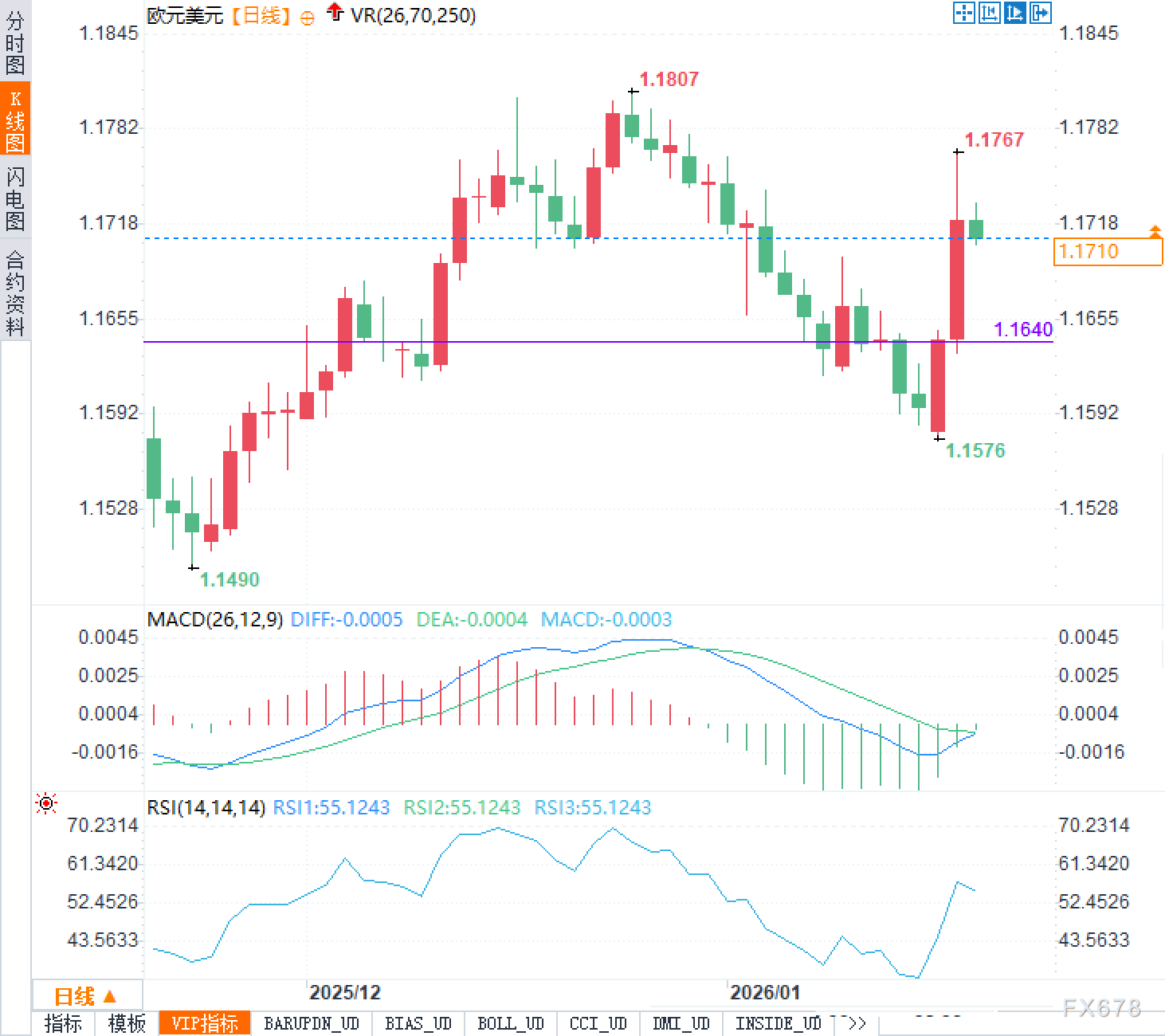 最近两天,欧元兑美元一口气涨了约1.1%,一度冲到1.1767的高点,虽然随后有所回落,但整体仍稳稳站在1.17上方。周三(1月21日)盘中最低也没跌破1.17这个关口,欧洲时段报价维持在1.1710附近,日内波动不大,市场像是进入了“等待模式”。