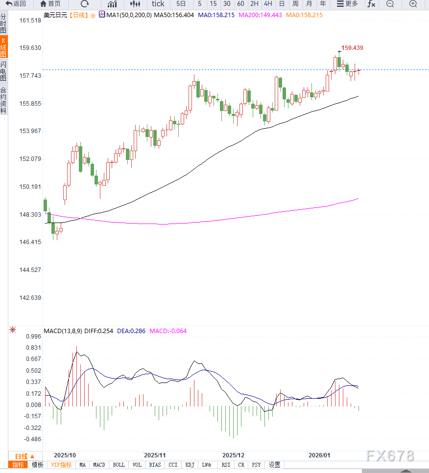 技术面来看,USD/JPY短线受100小时简单移动平均线(SMA)158.17压制,汇价持续在均线下方震荡,短期偏向空头。MACD及信号线接近零轴,直方图走平,显示动能有限。RSI徘徊在48附近,呈中性,缺乏明确方向。