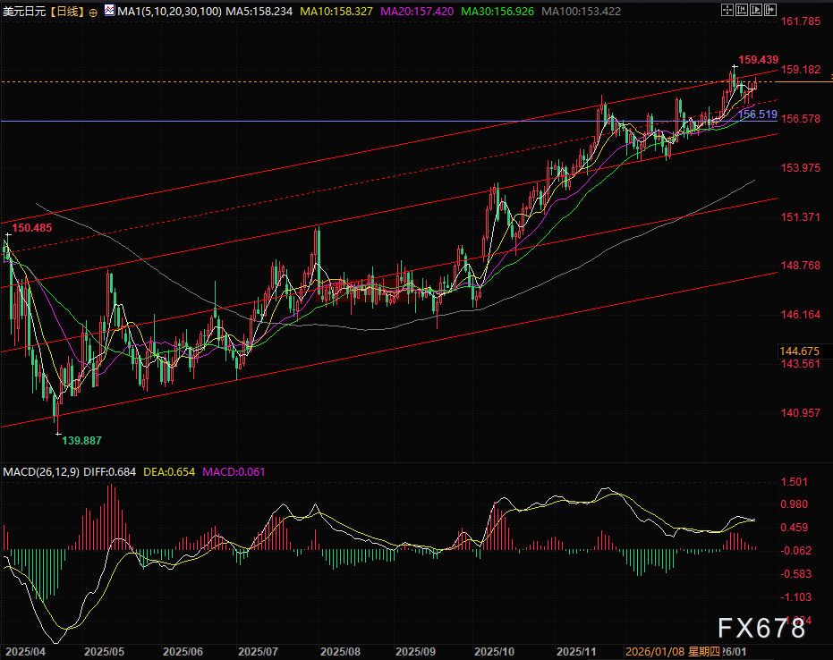 周四(1月22日)亚欧时段早盘,日元兑美元延续日内稳步下挫态势,触及逾一周低位,美元兑日元汇率持续向159.00关口逼近。