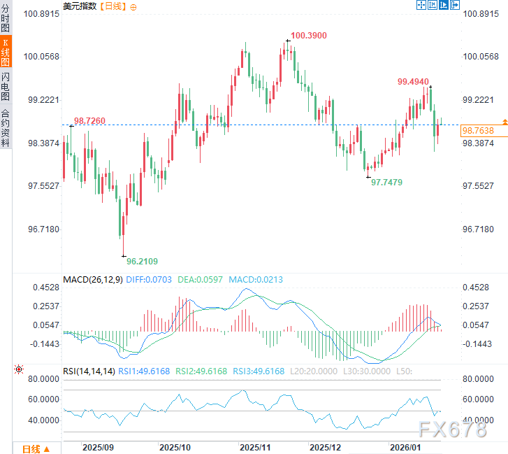 短期:市场将首先关注最终人选的身份及其首次政策表态,任何强化或削弱美联储独立性的信号都将引发美元剧烈波动。周四亚市时段,美元指数于98.75附近窄幅震荡。