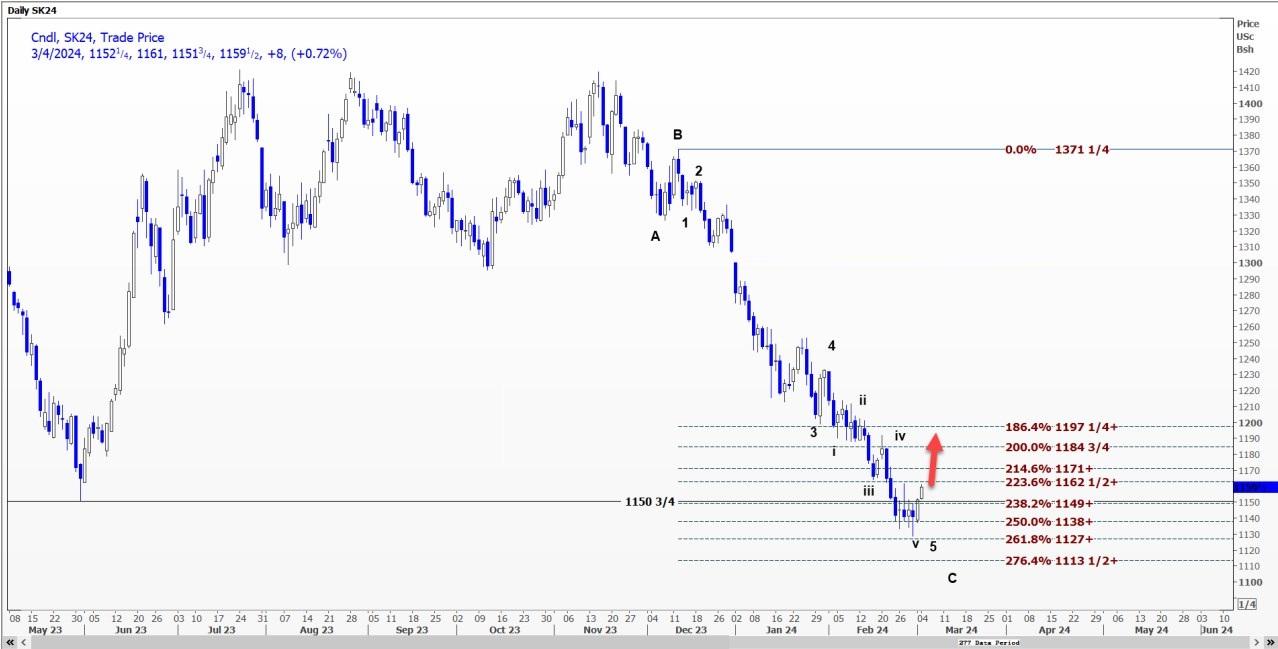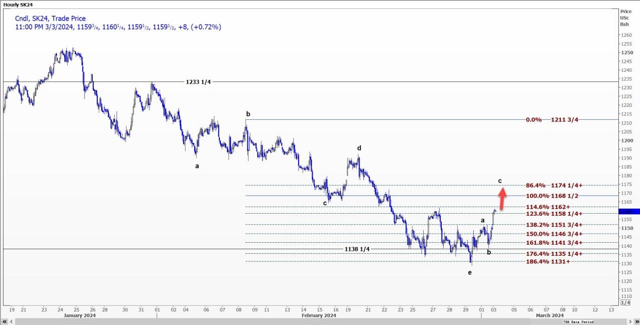 CBOT大豆5月合约SK24可能突破每蒲式耳11.62美元的阻力位,并升至11.6850-11.7450美元区间。
