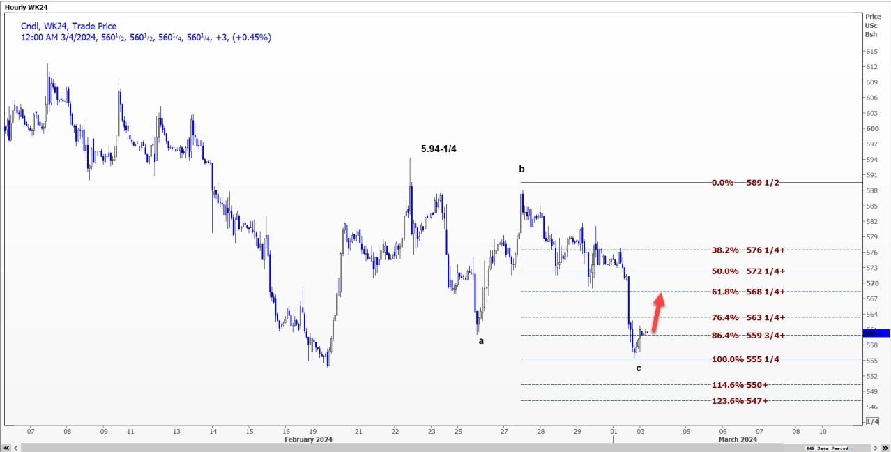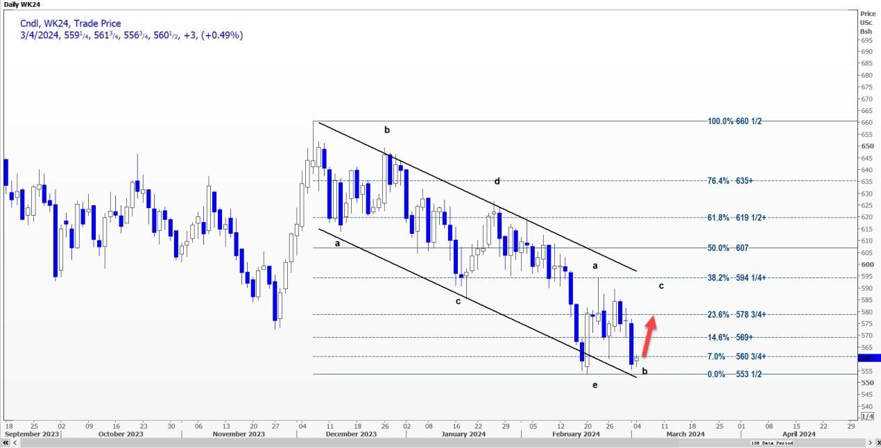 CBOT 5月小麦WK24可能会测试每蒲式耳5.6350美元的阻力位,突破该阻力位可能会打开通往5.6825-5.7225美元区间的道路。