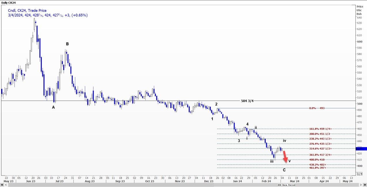 该合约在5.5525美元找到强劲支撑,这是自5.8950美元开始的c浪的100%预测水平。该波可能在该水平附近结束,也可能延伸到远低于该水平的位置。