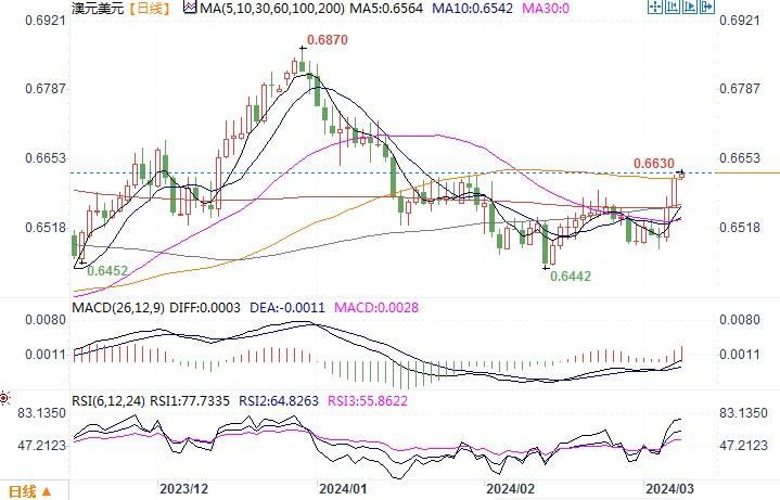 周四(3月7日),澳元兑美元上涨0.9%收盘于0.6616。这波涨势令澳元脱离三周低点0.6477美元。周三美联储主席鲍威尔在国会的偏鸽派证词发言,让市场相信美国利率今年仍有可能下调,扼杀了近期通胀反复可能使政策宽松化为泡影的说法。鲍威尔的言论拖累美债收益率和美元下跌,而一众非美货币则是趁势回升。就澳元本身而言,因为数据显示澳洲经济在去年第四季度几乎没有增长,凸显央行最终有理由降息。这在理论上应该对澳元构成压制影响的,但美元近期的下跌,则间接大大舒缓了澳元的压力。日线图上,澳元/美元上穿了近期的强阻力0.6600关口,MACD、RSI等技术指标开始转为上摆,显示澳元似乎有筑底回升的趋向。此前该货币对一直横盘于0.6620-0.6450区间内,若能继续上升,其幅度预计是横盘区间的点差(170个基点左右)。