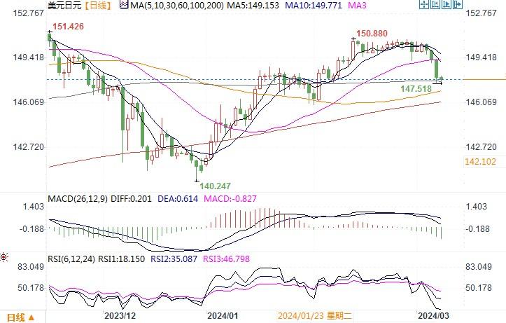 周四(3月7日),美元继续全线下跌,而美元兑日元下跌幅度也较为可观,达到0.92%报148.04,为一个多月来最低。周四的数据显示,由于劳动力市场继续逐步放松,上周美国初请失业金人数量没有变化。这可能会挑起投资者对于周五美国2月就业市场有所松动的猜想。与此同时,由于越来越多的人猜测日本央行最终可能在本月加息,导致日元似乎在产生逆转性的强烈走势。由于利差巨大,日元在过去两年的大部分时间里一直面临压力。此前,主要央行大幅加息以抑制通胀,唯独日本央行坚持超宽松货币政策立场,为此市场参与者大幅做空日元进行套利。而一旦出现任何对日元构成温和支撑的因素时,都可能引发日元大幅逆转性的波动。日线图上,美元兑日元布林带通道喇叭口开始急剧扩张,汇价剧烈跌至布林带下轨线之外,技术指标呈明显下摆,显示美元/日元高位空头极为积极,这其中不乏触发止损盘所带来的反向剧烈下行。投资者可参考右图表中的斐波那契回撤百分比所在目标位置,观察美元/日元此轮下跌是否能一一到达。