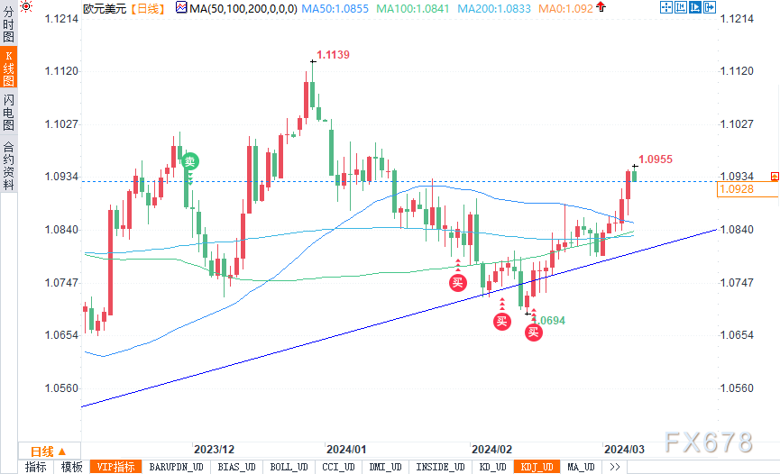 欧元兑美元周四反弹,在此过程中清除了主要阻力位置,并触及1月中旬以来的最高水平。在这一轮上涨之后,该货币对已经到达了重要阻力位1.0950的关口。价格在这里的反应将是关键,上破这一阻力可能会推动该货币对向1.1020移动。