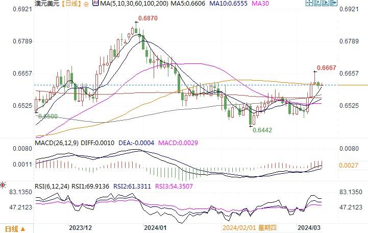 周一(3月11日),澳元兑美元出现小幅的回撤,当日下跌0.2%,收盘于0.6610美元。上周五出炉的美国就业报告表现错综,澳元一度冲高至0.6667美元。澳元自今年年初以来一直承压,但本月稍稍喘了口气,因人们对美联储有望在6月降息的信心不断增强,使得风险资产反弹。但美国经济状况看起来仍比其他主要经济体要好得多。因此也不能过于看弱美元。本周二的美国消费者通胀报告将对美元走势产生重大影响。因此在数据公布前,澳元多头出现谨慎性平仓以减低风险。此外澳元/日元交叉盘因日元的走强在走低,也影响到澳元/美元的走势。日线图上,澳元/美元呈大涨过后的小幅调整之中,若调整能保持在0.66之上,则后市仍有望延续上升的走势。一切要观察周二晚间美国通胀数据能带来什么样的冲击影响。