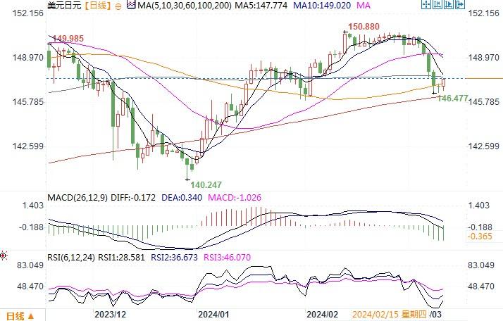 周一(3月11日),美元兑日元收盘于146.94,日内下跌0.1%。日元兑美元汇率本周一已是连续第四个交易日走高。消息人士告诉路透,在日本最大企业大幅加薪的预期下,越来越多的日本央行决策者开始倾向于在3月18-19日的会议上结束负利率。今年的年度“春斗”(Shunto)工资谈判结果将于周三公布。与此同时,日本上一季度经济增速的上修意味着该国避免了技术性衰退,这为日本经济能够经受住紧缩政策的考验增添了论据。2月度就业数据显示美国劳动力市场降温,使美联储今年保持在放松政策的轨道上,这导致了美元近期的下跌。目前投资者将关注本周二的美国消费者物价指数(CPI)报告,如果数据意外呈现下降,将会为美联储降息进一步提供了理据。美元也会因此继续受压下行。相反,若数据增长情况仍然保持强劲,那么美元或会受到空头回补的提振。日线图上,美元/日元在146.50水平暂时受到支撑,跌势显示有所缓和。然各项技术指标未显示有转向的迹象,依然保持明显的下摆趋向,表明美元/日元仍处在弱势之中。继续留意146.50的支撑,若下破,美元/日元将延续回撤之旅。若撑住,料会进入一段空头回补调整过程。