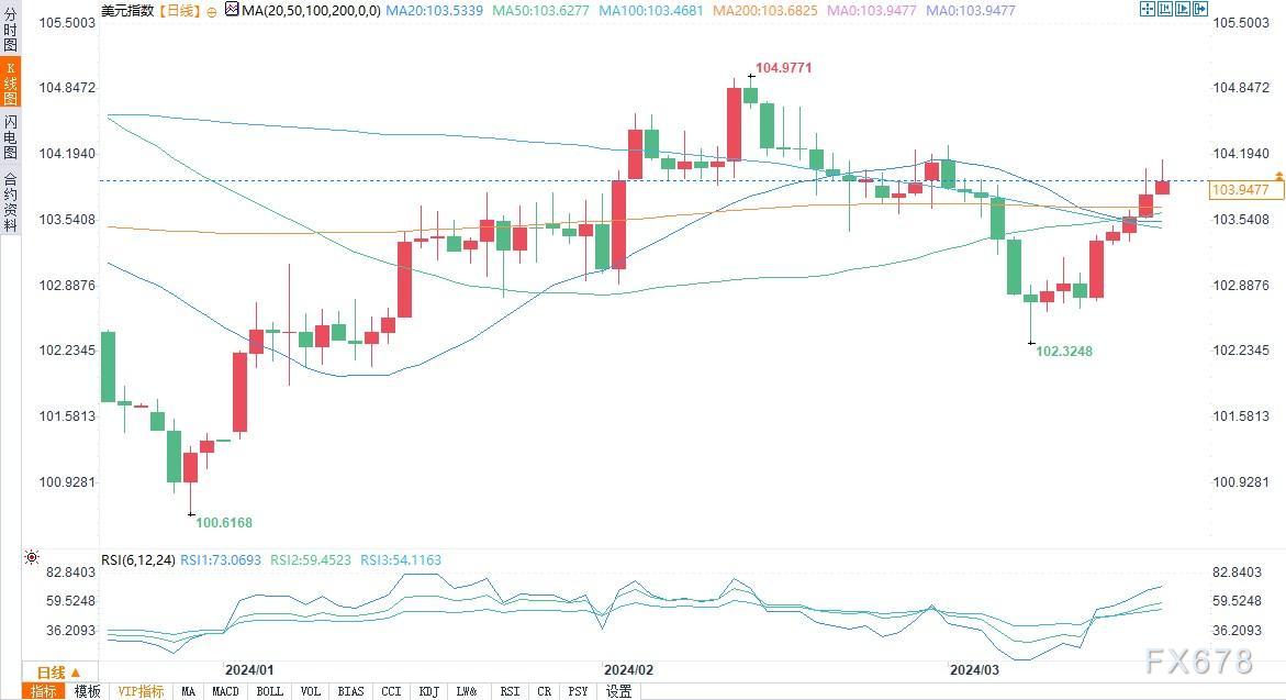 周四(3月21日),在美联储利率决议公布之前,美元连续第五次上涨开始消退,美元指数回落至104.00下方。