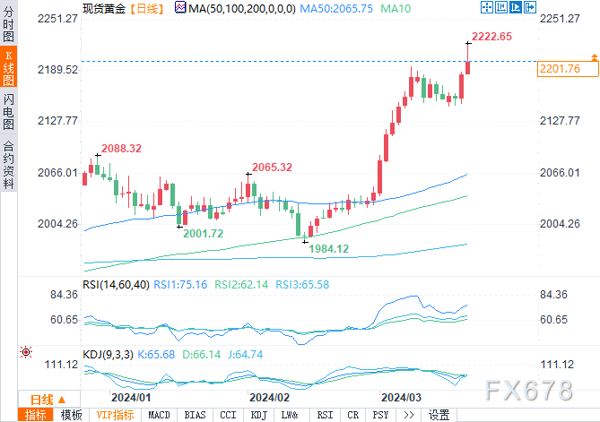 美联储在三月会议上在很大程度上维持三个月前的经济预测摘要中采用的政策前景,美元指数下跌,现货黄金价格上涨,创下2222.65美元每盎司的历史新高。
