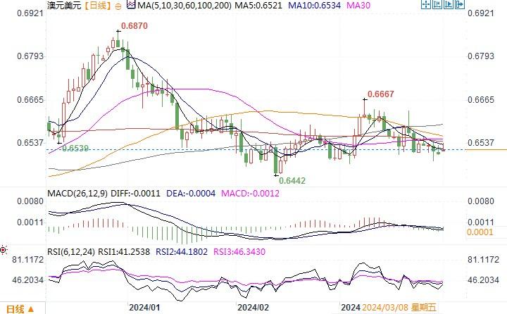 周五(3月29日),美国公布的2月核心PCE同比增速放缓至2.8%,符合预期,也是近三年的最低水平。在数据之后,美联储主席鲍威尔发表讲话表示在没看到通胀切实回落目标范围内之前,美联储不能急切降息。但就其讲话的整体内容来看,市场人士认为,鲍威尔的言论暗示美联储依然坚持通胀将在年内下降至2%的目标,同时也没有改变有关今年降息的预期。对于美国周五的数据以及鲍威尔讲话如何做出如何反映,还有待本周一市场重新开市后加以观察。日线图上,澳元/美元继续维持在布林带通道中轨线与下轨线之间(0.6560-0.6470之间)横盘震荡之中。技术指标略偏于下摆,显示澳元略偏于弱势。若澳元/美元跌穿很盘低位支撑0.6470,下行将变得明显。只有重返0.6560之上,弱势状态方有望得以改善。