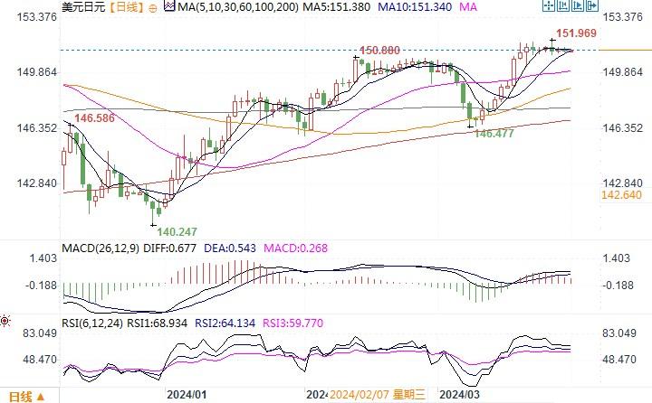 周五(3月29日),因大多数主要交易市场过复活节假日休市,汇市交投平淡。来自日本方面的数据显示,东京3月核心消费者物价指数(CPI)较上年同期上涨2.4%,预期上涨2.5%,前值为上涨2.5%,整体CPI同比上涨2.6%。日本2月工业产出疲软,较前月下滑0.1%,预期为增长1.4%,前月为下滑6.7%。日本2月零售销售良好,较上年同期成长4.6%,预期为成长3.0%,前值为成长2.3%。2月失业率为2.6%,预期为2.4%,前值为2.4%,求才/求职比为1.26,前值为1.27。东京通胀放缓、产出下滑,为日本央行加息前景蒙上阴影。相反,到美国经济表现强劲、美债保持着高收益率的现状,似乎不利于日元的影响因素居多。然而,日本财务大臣铃木俊一重申不乐见汇率快速波动的讲话,给到市场一定的威慑,交易员担心一旦美元/日元向上冲破152心理关口,将招致日本央行入市干预。但市场仍认为日本采取任何实际干预行动都只是暂时的补救措施,还不足以令美元/日元发生根本方向性逆转。因为美元与日元之间的息差巨大,对于套利冒险投资交易者来说,这足够吸引力。继续留意152心理关口能否突破,若突破后,上方空间进一步化开。下方的强支撑在150附近。