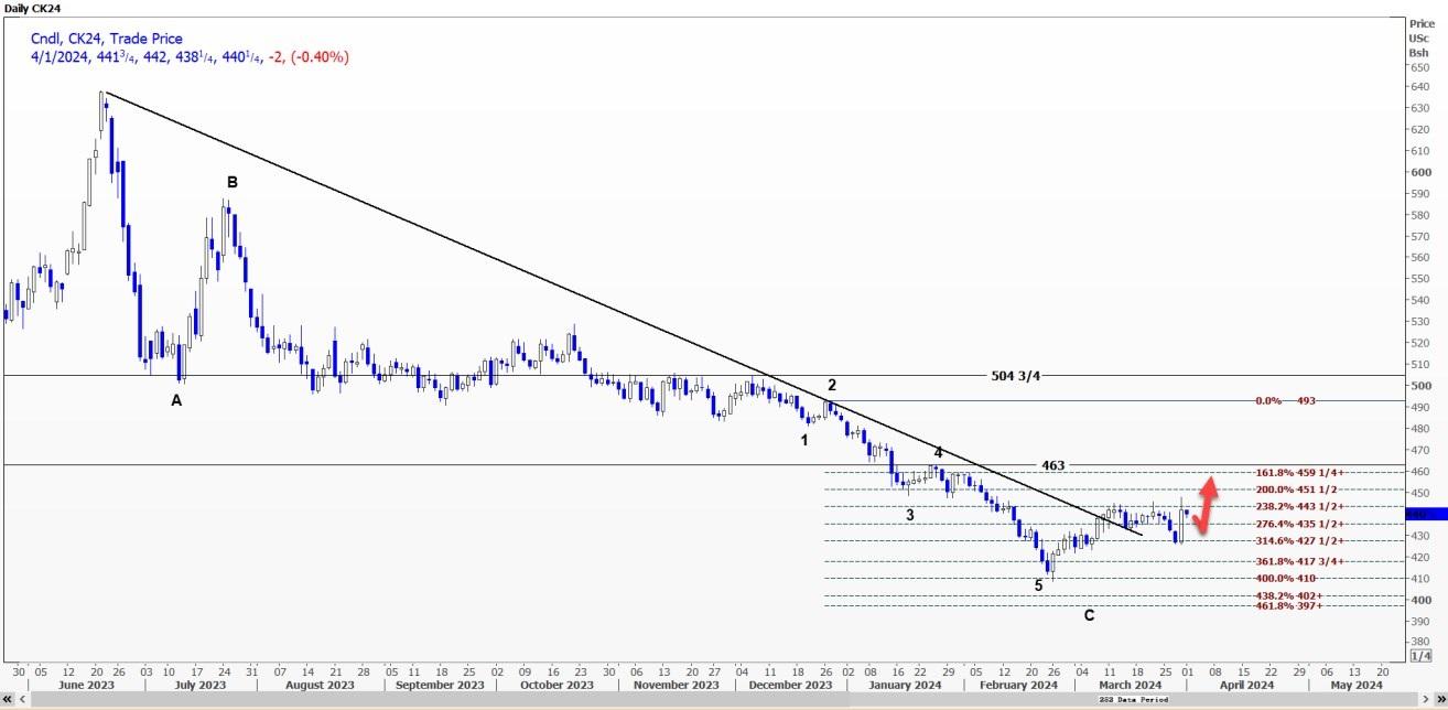 芝加哥期货交易所(CBOT)玉米CK24可能重新测试每蒲式耳4.3825美元的支撑位,并很有可能跌破该水平并跌至4.3575美元至4.3725美元的区间。