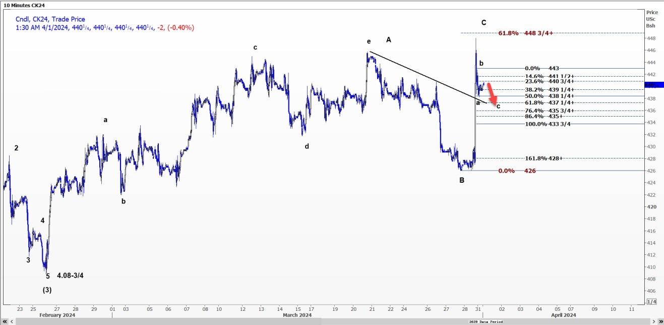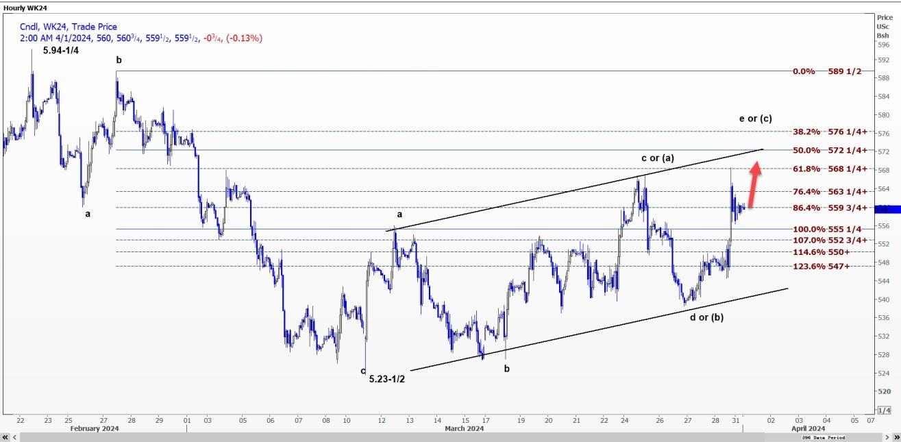 该合约处于e浪或c浪中,两者都能够进入5.7225美元至5.7625美元的范围。