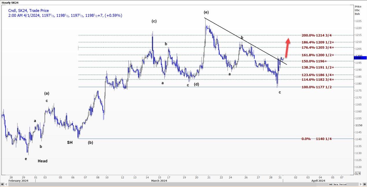 该合约突破了下跌趋势线。这一突破表明,自3月21日高点12.2675美元以来的修正已完成。
