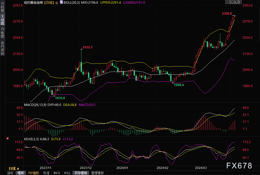 黄金期货已升至2300美元/盎司上方。短期内,期金进一步涨向2400美元/盎司似乎是可能的。