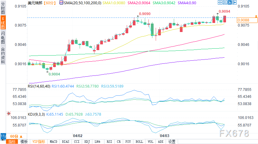 周三(4月3日),欧元/美元震荡走高后回落,美元/瑞郎震荡走高。