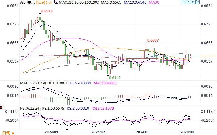 周五(4月52日),澳元/美元上周五收跌0.15%至0.6578。上周初期,由于大宗商品价格上涨,澳元/美元曾一度反弹至0.66水平附近,随后在周五受美国强劲就业数据推动美债收益率上升后,澳元/美元有所回落。日线图上,澳元/美元一度从宽幅横盘震荡的底沿0.6480附近反弹重新冲上布林带中轨线之上,目前在10日移动均线0.6540附近得到暂时的支撑,若失守后将增加下行压力。上方的阻力位在上周高点0.6619和日线顶部0.6630/40。技术指标MACD有重新形成金叉迹象,显示澳元低位受到的支撑性还是比较强硬。