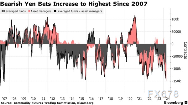 根据美国商品期货交易委员会(CFTC)的数据,截至4月2日当周,持有的净日元空头合约达到了148,388份,创下了2007年1月以来的最高纪录。