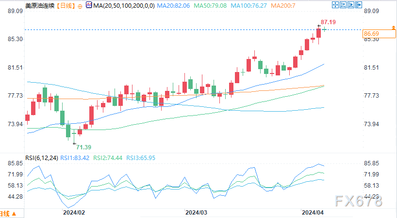 本周油价连续第二周上涨,这一上涨趋势可归因于欧洲和中东地缘政治紧张局势加剧,以及对供应紧张的担忧。布伦特原油和WTI原油均已达到去年10月以来的最高水平,显示出强劲的看涨势头。