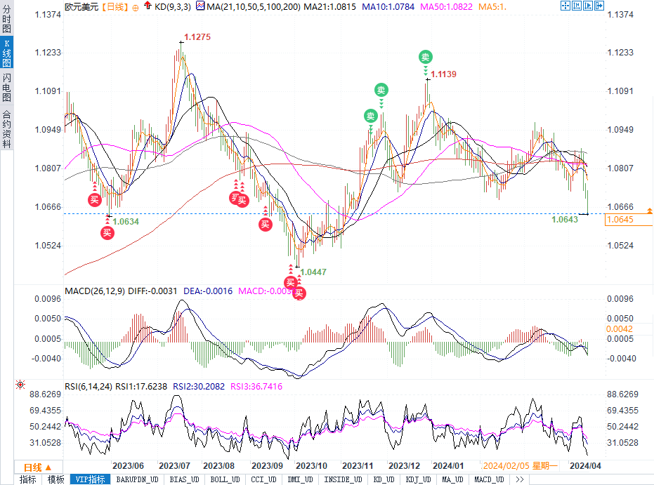 欧元兑美元汇率在周四跌至近两个月的低点1.0699美元,目前交投于1.07125美元。这一下跌的原因在于市场日益预期欧洲央行将在6月开始逐步退出其前所未有的加息政策,这一时间点远早于美联储。由于美国通胀率居高不下,美联储难以开始放宽货币政策。