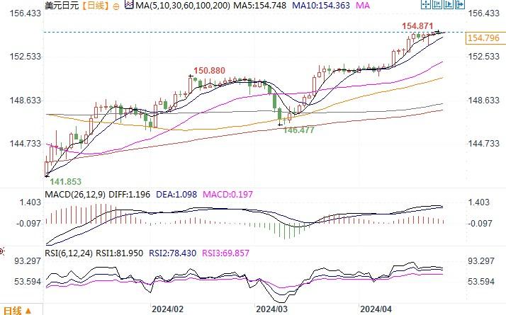 北京时间4月24日11:20 美元兑日元 报 154.827/836。