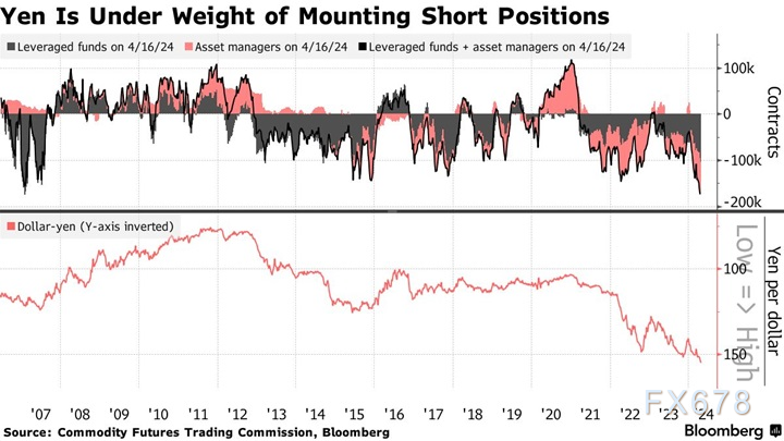 美国商品期货交易委员会(CFTC)的数据显示,截至4月16日,杠杆基金和资产管理公司押注日元走软的合约增至逾17.3万份,为CFTC自2006年追踪该数据以来的最高纪录。