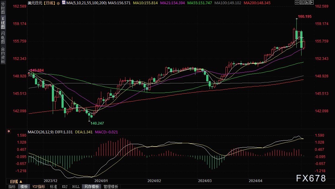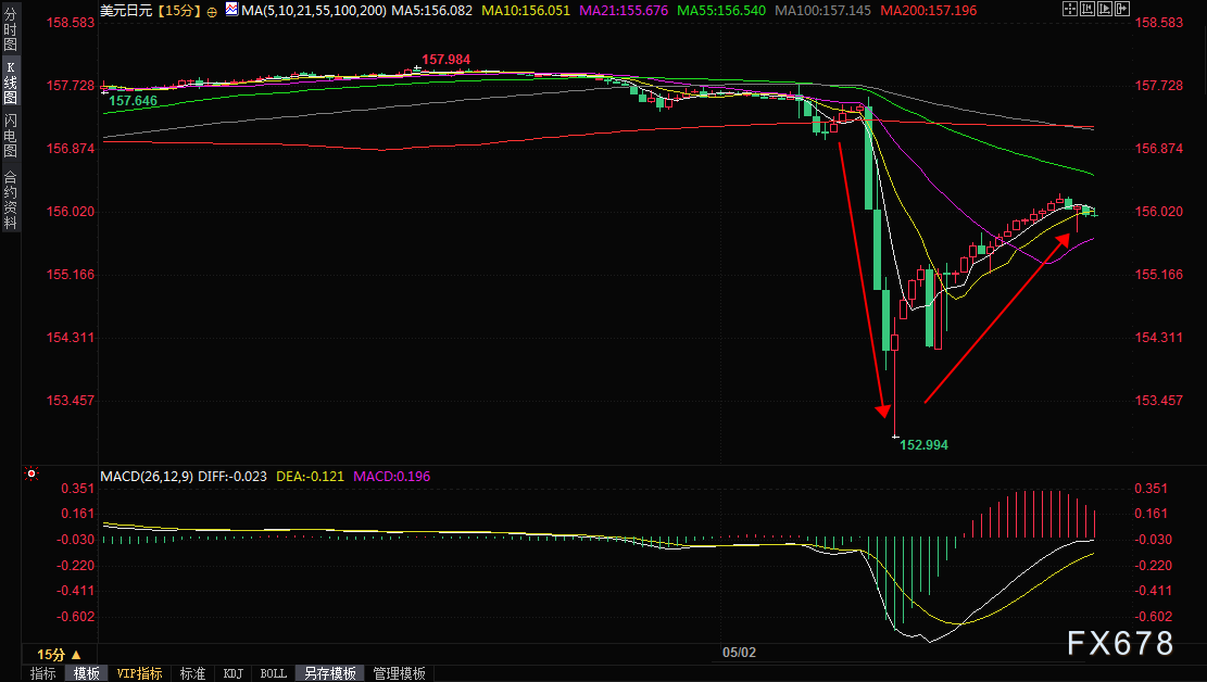 周四(5月2日)亚洲时段,美元兑日元震荡反弹,最高触及156.28,较隔夜创下的近三周低点152.99已经反弹逾300点。隔夜纽约时段尾盘,美元兑日元一度从157.55附近大跌逾400点,创下近三周新低至153附近,交易员和分析师迅速将日元突升归因于日本当局的干预。
