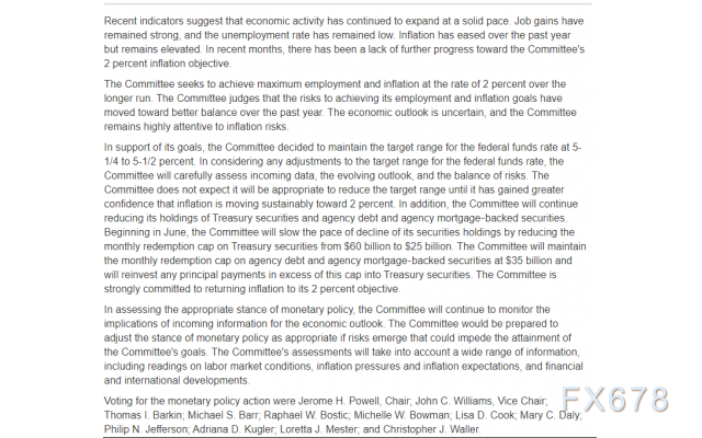 为了支持这些目标,委员会决定维持联邦基金利率目标区间在5.25%-5.5%不变。在考虑对联邦基金利率目标区间的任何调整时,委员会将仔细评估新公布的数据、不断变化的前景和风险平衡。委员会预计,在对通胀持续向2%回落更有信心之前,不宜降低利率目标区间。此外,委员会将继续减持公债、机构债和机构抵押贷款支持证券(MBS)。从6月开始,委员会将通过将每月公债赎回上限从600亿美元降低至250亿美元,减缓其证券持有量下降的速度。 委员会将把机构债和机构抵押贷款支持证券的每月赎回上限维持在350亿美元,并将超过此上限的任何回笼本金再投资于公债。委员会坚决致力于让通胀率回归2%的目标。