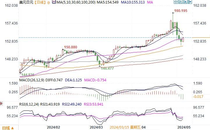 周五(5月3日),美元兑日元触及三周最低151.86,最终下跌0.48%,收盘于152.90。上周早些时候日本当局入市干预,使日元创下2022年11月以来的最大周线百分比涨幅。而周五当天美国的非农数据不理想,进一步助益日元的回升。周五来自美国的数据显示,美国4月新增就业岗位17.5万个,低于经济学家预期的24.3万个。4月薪资同比增长3.9%,低于预期的4.0%,3月涨幅为4.1%。失业率从3.8%上升至3.9%,但连续第27个月保持在4%以下。4月就业增长放缓幅度超过预期,且薪资同比涨幅降温,促使市场增加对美联储今年将降息两次的押注。这给到美元一定的压力。但是,来自美联储重要官员的声音则认为,数据仅仅说明劳动力市场有所松动,并不表明经济在大幅下滑。美联储理事鲍曼周五就表示,即使联储将指标利率维持在当前水平,通胀仍应该会继续下降,同时重申如果通胀进展趋缓或逆转,她愿意上调政策利率。芝加哥联储总裁古尔斯比表示,就业报告显示增长“稳健”,但增速放缓,这可能会让美联储官员对经济并未过热更有信心。因此,除非周五非农这种趋势继续下去,否则该报告本身不太可能影响美联储的政策改变。日线图上,美元/日元自160附近遭遇干预大幅回落之后,各项技术指标的超买状况正得以缓解,当前在152附近暂时受到支撑。若汇价进一步有效跌穿152,美元回落的幅度将进一步延展。相反若撑持在上述水平之上,恐怕美元/日元仍存在试高的可能性。