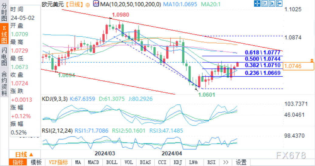 周五(5月3日)欧盘时段,欧元保持坚挺基调,并将涨势延续至连续第三天,打压关键阻力位1.0750区域(1.0885 - 1.0601 -日Kijun-sen的50%回撤位)。