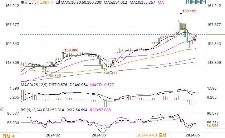 周二(5月7日),美元兑大多数货币周二上涨,全天稳步走高,美元兑日元也连续第二个交易日走强,收盘阶段上涨0.55%报154.73。在上周的美联储政策会议和不及预期的美国就业报告之后,市场对今年两次降息的预期有所提升,再加上日本央行适时地加以干预,美元/日元出现大幅的回撤。然而,美联储官员明尼阿波利斯联储总裁卡什卡利在Milken Institute的会议上表示,通胀进展停滞不前,通胀保持高位的部分原因是房地产市场走强,意味着美联储将需要在“较长一段时间内”保持借贷成本稳定,甚至可能全年保持稳定。其言论代表了美联储内部不少成员的倾向,即通胀情况仍不容乐观,高利率有必要维持更长一段时期。因此在美联储没有明确迹象将进入降息阶段的情况下,美元就有理由维持着强势。巨大利差的诱惑,尚不能阻止投机者套利交易的趋鹜。但需要注意的是,日本财务省财务官神田真人表示,日本可能不得不对任何无序的、投机性的外汇走势采取行动,这表明日本央行仍随时准备干预市场。日本央行的干预决心一定程度上会掣肘套利交易的前行,并可能起到降温的作用。技术图形上,美元/日元仍处在超跌反弹之中,上方还是留意多次提到的多空分水岭155的阻力情况。上破,美元有望进一步探高;遇阻,则小心美元进一步作深度的回调。