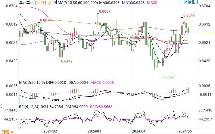 周二(5月7日),澳元兑美元收盘下跌0.4%报0.6596。周二,澳洲央行一如预期维持利率不变,对政策前景的鹰派论调不及许多人的预期。在第一季通胀和劳动力市场未能如预期般降温之后,澳洲央行并未如一些经济学家所预期的那样恢复紧缩倾向。相反,澳洲央行维持了与3月份会议基本相同的措辞,表示在利率方面不排除任何可能性,只是补充说将对通胀上行风险保持警惕。交易商削减对今年再次加息的押注;澳洲10年期公债收益率下跌11个基点。澳联储的利率会议未能给到澳元进一步上冲的支持。不过,澳洲央行经济部门周二发布的预测确实更加鹰派,认为现在要到2025年中期才会降息,比在2月份时的预测晚了9个月。随着时间的发展,如果澳联储仍是有望远晚于美联储降息,则澳元或会从中受到相应的支撑。日线图上,澳元/美元短线受阻于此前宽幅震荡区间的顶部0.6640,但上行轨道未遭破坏,技术指标也未有转向迹象。短线澳元/美元或面临着震荡整理的走势,下方主要留意0.6560的支撑力度。上方只有突破0.6660,或才能呈现明显的上行态势。