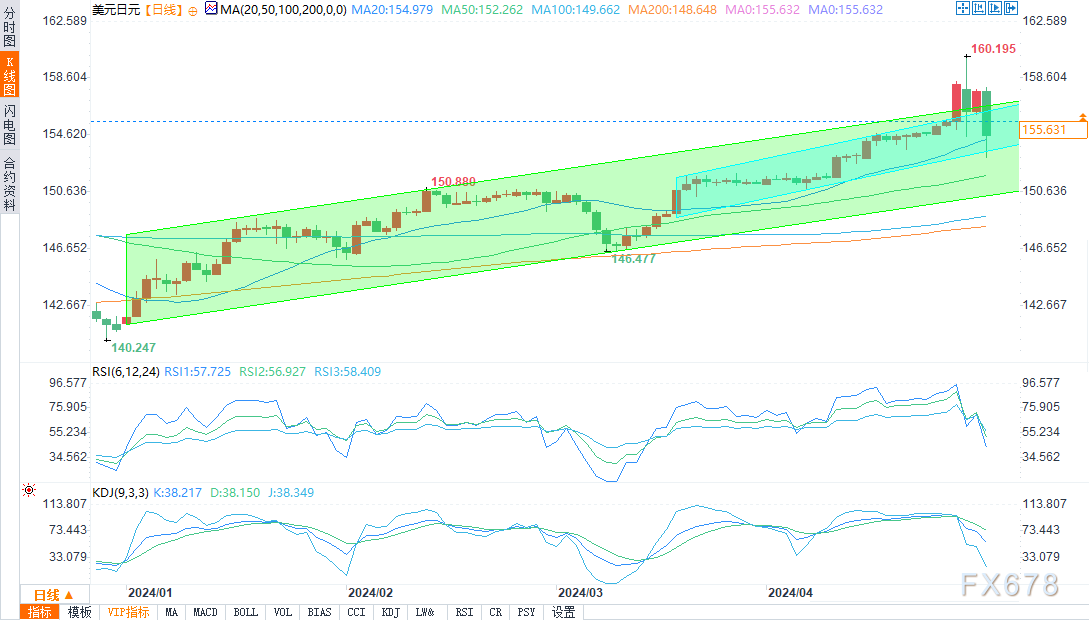 周四(5月9日)北京时间23:24,美元/日元报155.603/614,涨幅0.08%。