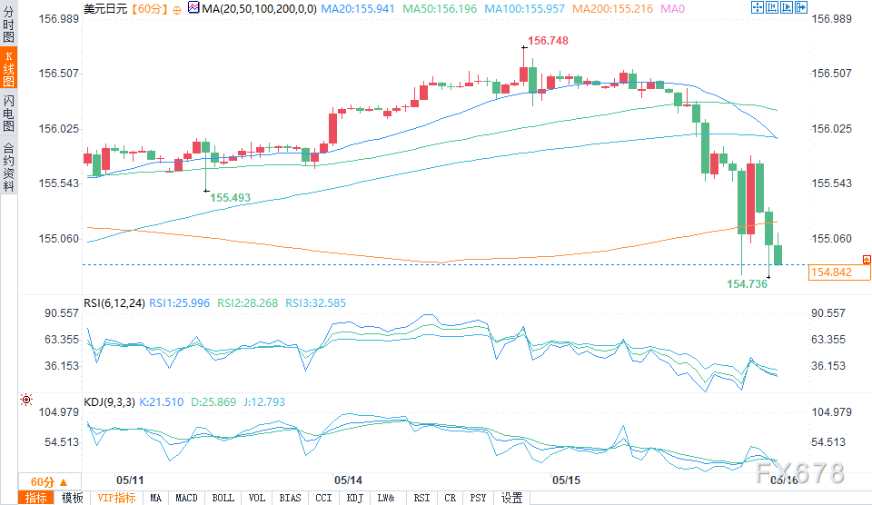 周三(5月15日)美市中,美元/日元汇率一度下跌1.1%,至154.736,随后收窄部分跌幅。最近几周,日元汇率大幅波动,4月底自1990年以来首次跌破160,随后在当局两轮疑似干预后大幅反弹。