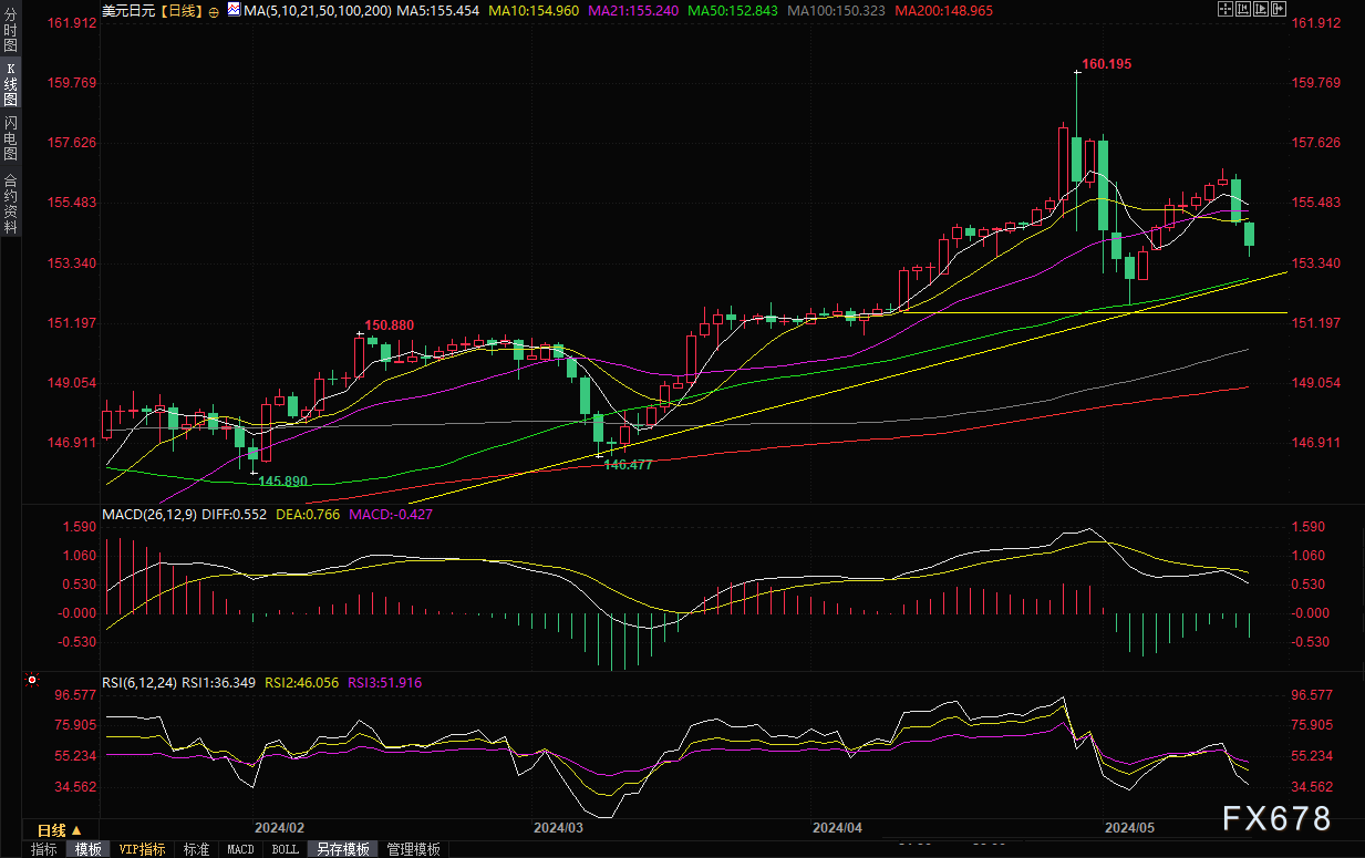 短线留意50日均线152.85附近支撑,若跌破该位置,可能会进一步试探4月10日低点151.68附近支撑