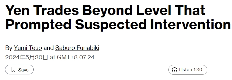 周四(5月30日),美元/日元升至157.61,最高触及157.67。据彭博报道,日元汇率突破引发疑似干预的水平。文章释出重磅信号,日本当局可能已出手购买3.5万亿日元。