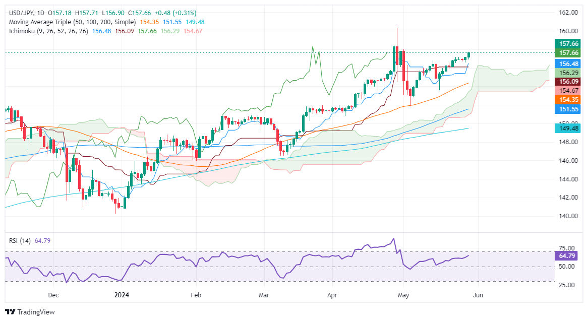 FXStreet分析师Christian Borjon Valencia表示,在突破5月23日高点157.19的阻力位后,美元/日元恢复了上涨趋势,但随着该货币对温和上涨至158.00关口,买家似乎持谨慎态度。