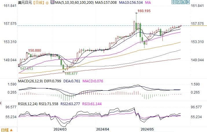 周二(5月28日),美元/日元涨0.19%收盘在157.16。美元多头在疑似干预水平(157.50)前可能畏首畏尾,波幅有限,但在利差交易的驱使下,美元仍然似乎顽强地在试高之中。而且对于美联储2024年只降息一次的可能性越来越大,日元净空头四周来首次再度上升。日线图上,美元兑日元继续朝着布林带上轨线逼近,相对强弱指数(RSI)在超买水平附近趋于稳定,指向性不太明朗。美元/日元需要升破最近的157.19高位,或会重新引发涨势。下方关键支撑位在10日均线156.30,继而是155.50附近。