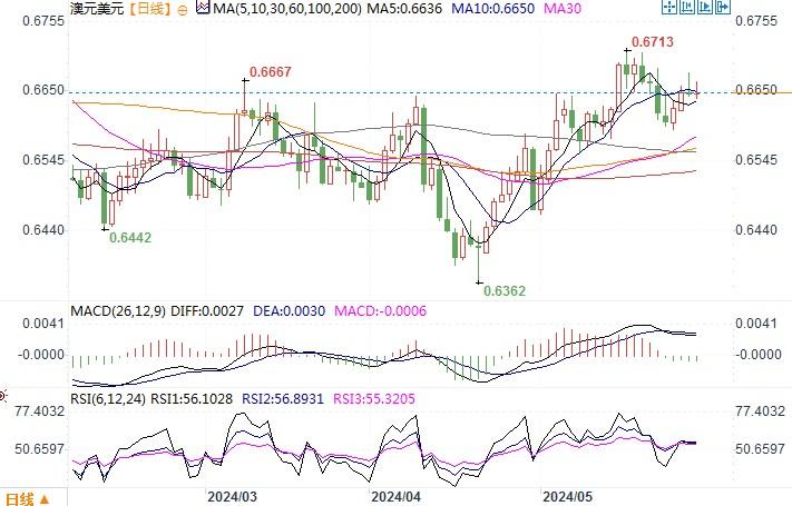 周二(5月28日),澳元/美元上微跌0.04%,收盘在0.6648。周二澳洲4月零售销售不及预期,零售销售增长0.1%,低于预期的0.2%;3月份为下降0.4%。数据显示消费者持谨慎态度,因为高借贷成本和租金上涨带来压力。虽然市场对该数据反应淡然,但最终还是稍稍抑制了澳元的升势。随后,澳洲4月CPI将于周三公布,预计同比涨幅将从3月的3.5%降至3.4%。该数据对于澳洲央行预期很关键,如果显示通胀下降明显,则会提升澳联储降息的预期,从而不利于澳元。相反澳元则有机会向更高水平攀升。之前得益于央行对通胀持谨慎态度,市场预期2025年5月之前没有100%的可能性宽松政策,澳元因此获得支撑出现反弹。如果这种预期风向产生变化,要提防澳元/美元自4月中旬以来的升势产生逆转的风险。目前下方的关键支撑在0.6580,若跌穿该水平,需小心防范澳元进入跌途的风险。