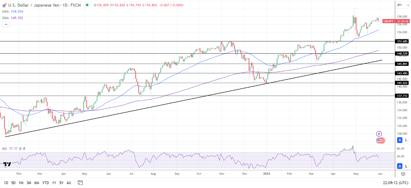 14天RSI为57.37,表明美元/日元将回升至4月29日的高点160.209,然后进入超买区域。