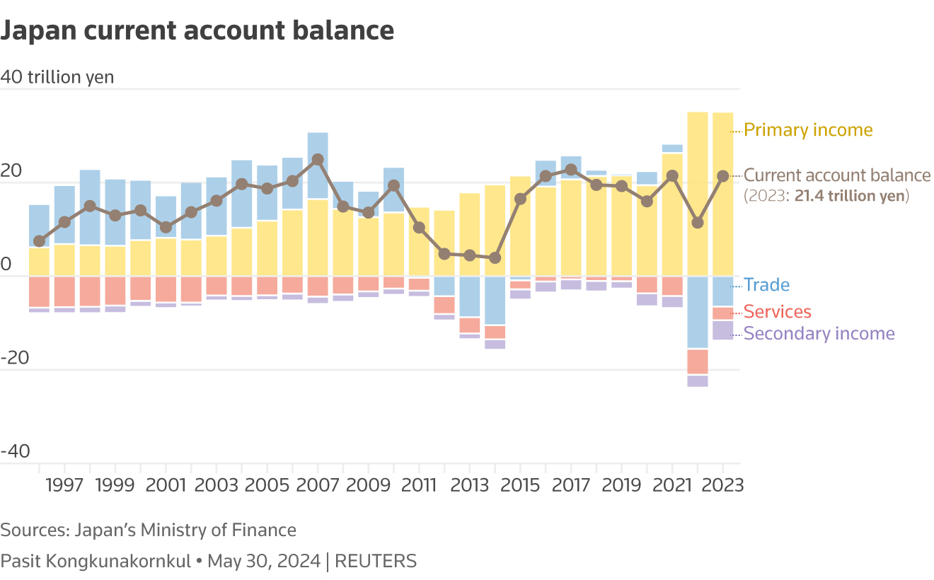日本财务省的数据显示,日本2023年的经常账户盈余约为21万亿日元,约合1340亿美元,这表明日本的收入仍多于其在海外的支出。