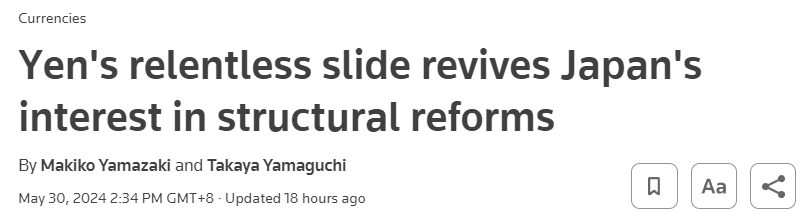 日元持续贬值下,周四(5月30日)报道,日本政策制定者将注意力转向更多结构性经济因素,已成立20人改革小组。日元下跌原因通常被归咎于美日巨大利差,但日元持续疲软已让当局注意到其他更根本的驱动因素。