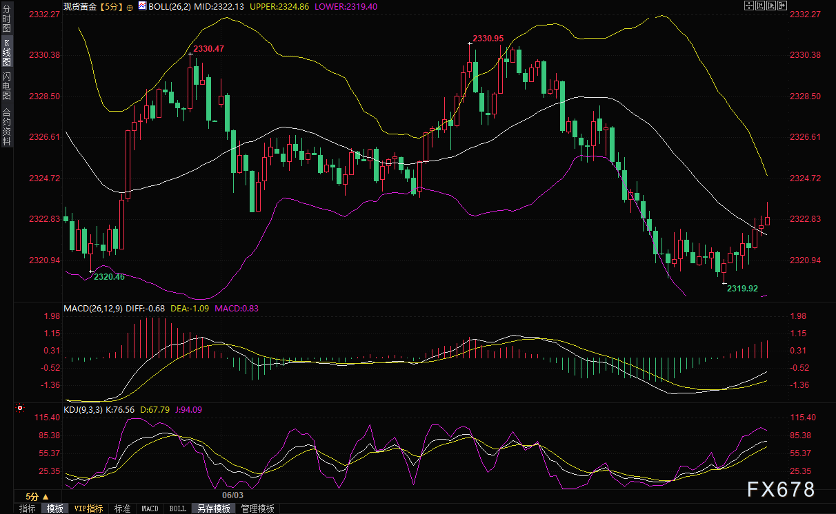 周一(6月3日)亚市盘中,现货黄金短线震荡下探,一度短暂失守2320关口,最低触及2319.92美元/盎司,刷新日内低点,较时段高点下跌逾10美元,目前交投于2322.05美元/盎司附近。