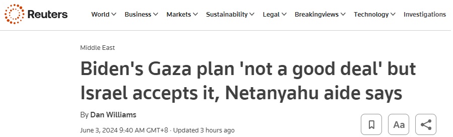 英国路透周一最新报道称,以色列总理内塔尼亚胡(Benjamin Netanyahu)的一名助手周日证实,以色列已经接受美国总统拜登(Joe Biden)提出的一项旨在结束加沙战争的框架协议。